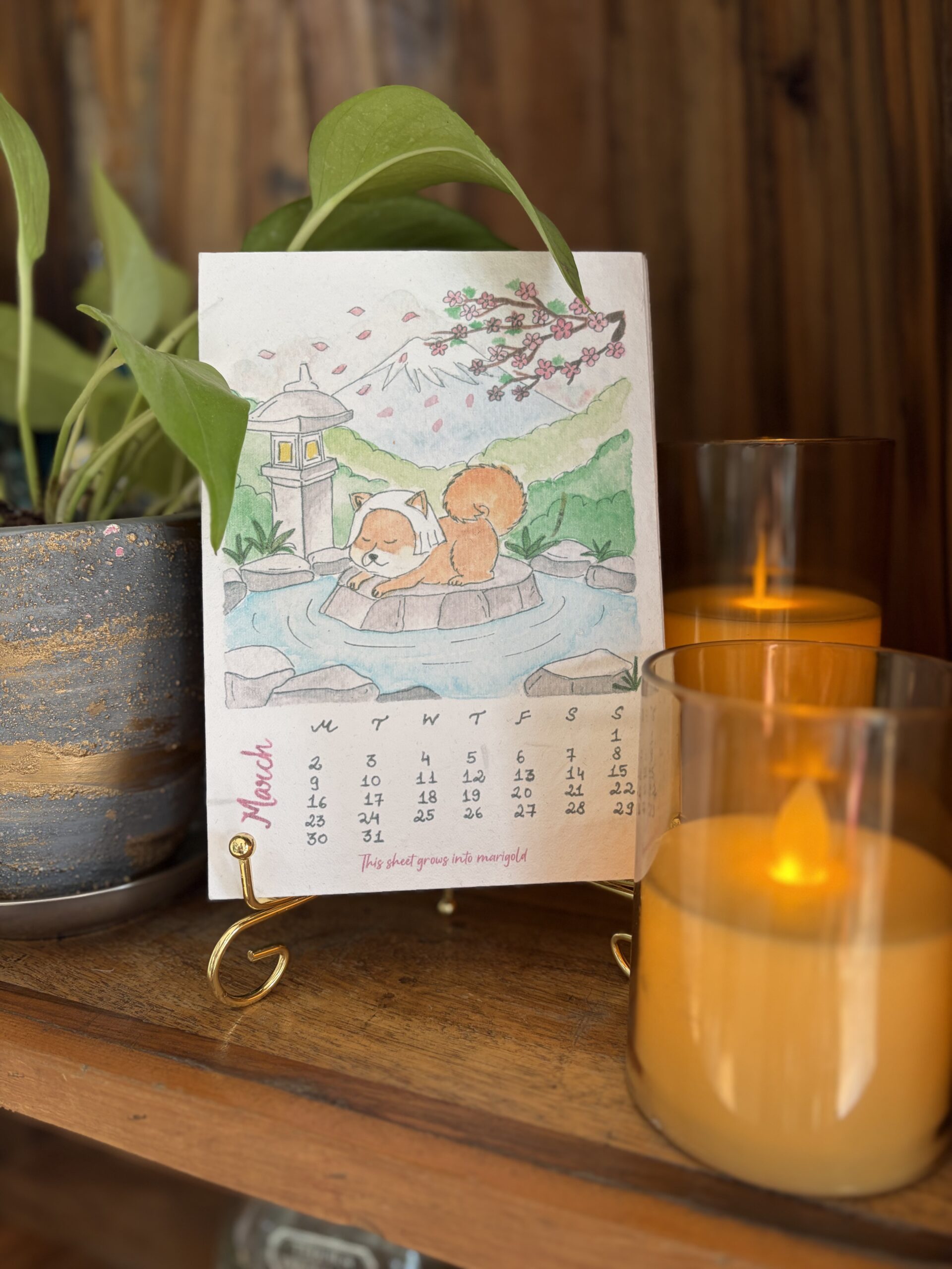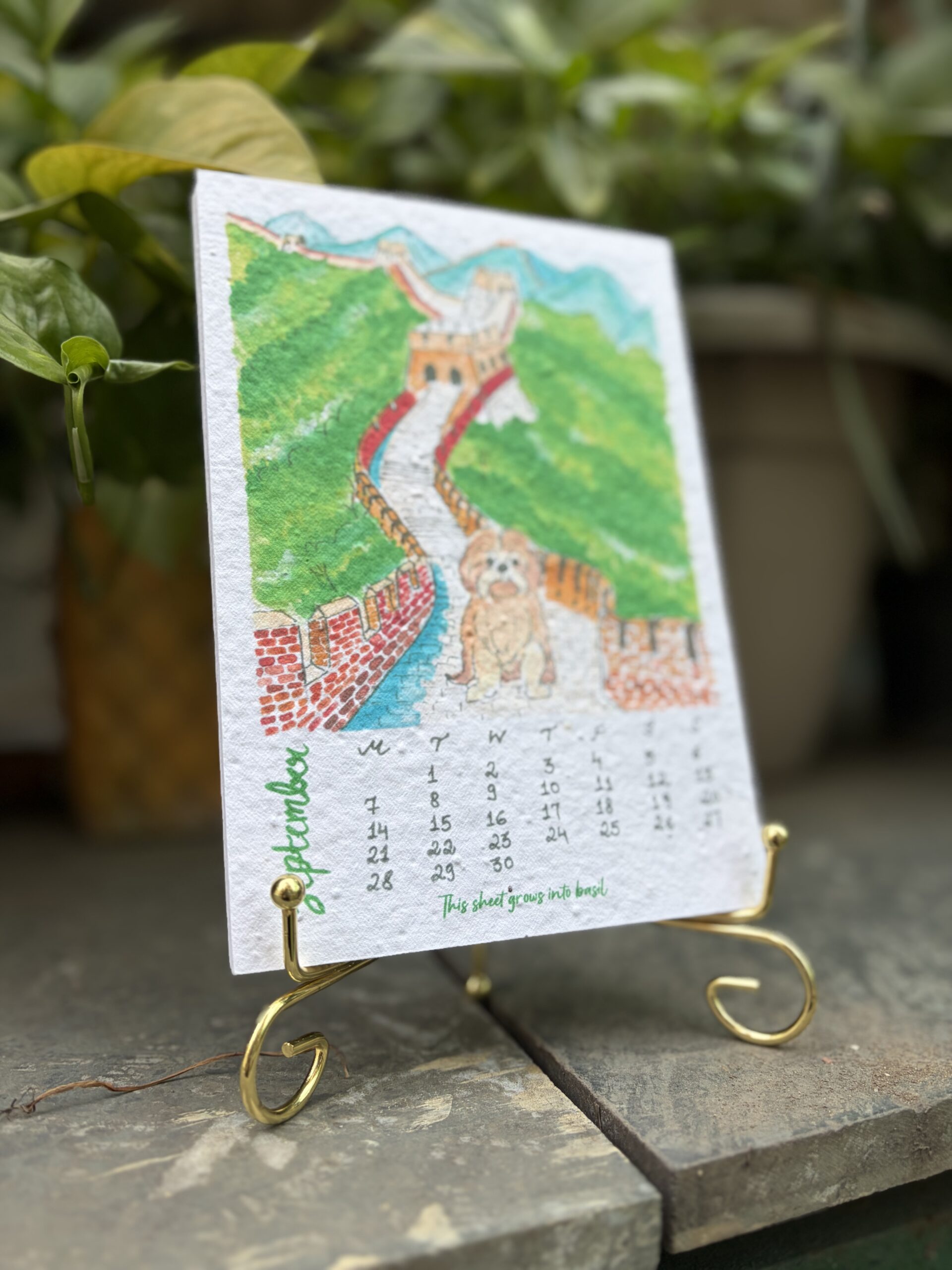 This unique desk calendar features hand-painted illustrations printed on plantable seed paper, designed to grow into plants once planted. Sized 5 × 7 inches and paired with a minimal golden stand, it brings art, nature, and warmth to your everyday space.